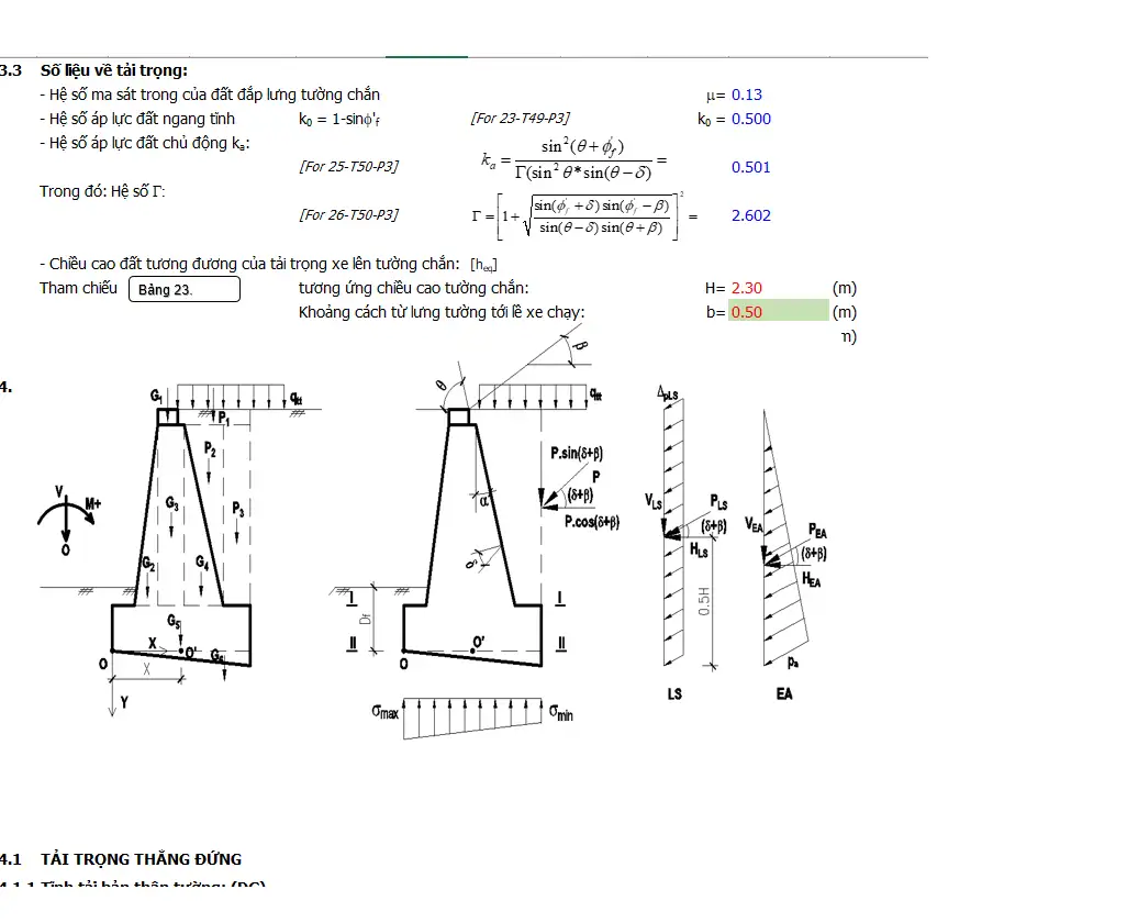 Bảng tính tường chắn BT trên móng cọc tre-cừ tràm theo TCVN 11823-2017
