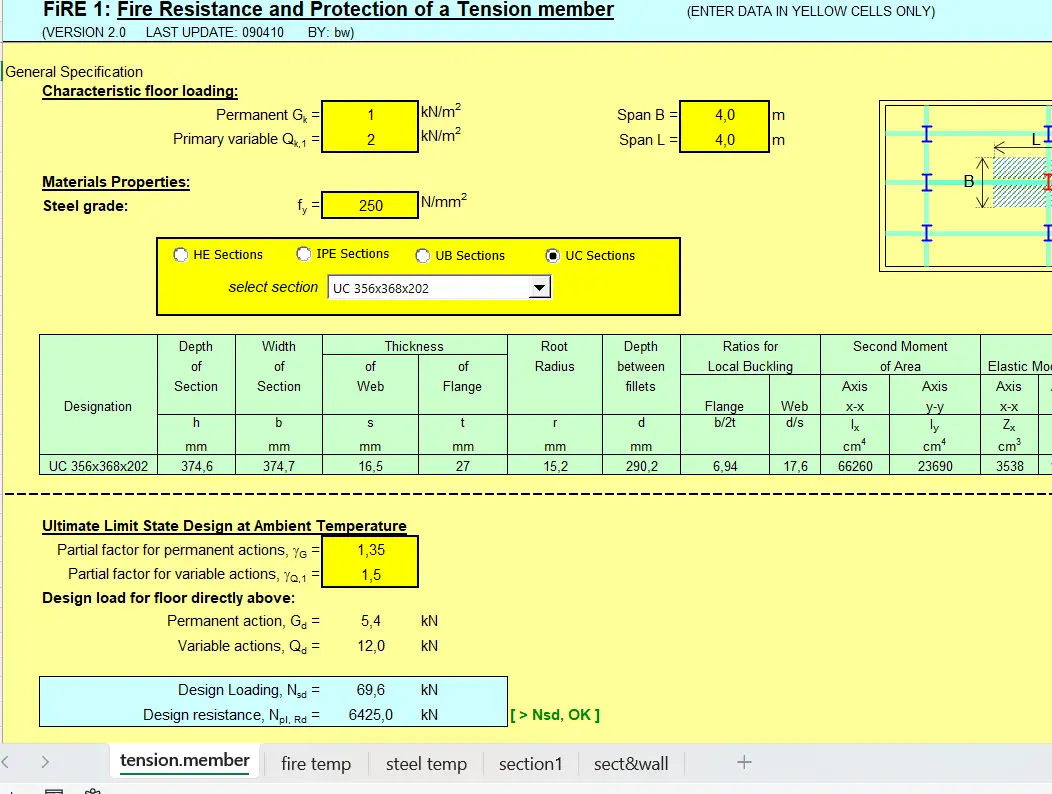 1-Fire Resistance Design – Eurocode.xls Thiết kế Kháng Lửa cho Thanh Thép Chịu Kéo (Tension Member). EN 1993-1-2 (Eurocode 3) Tính toán khả năng chịu lửa cho cấu kiện thép chịu kéo.