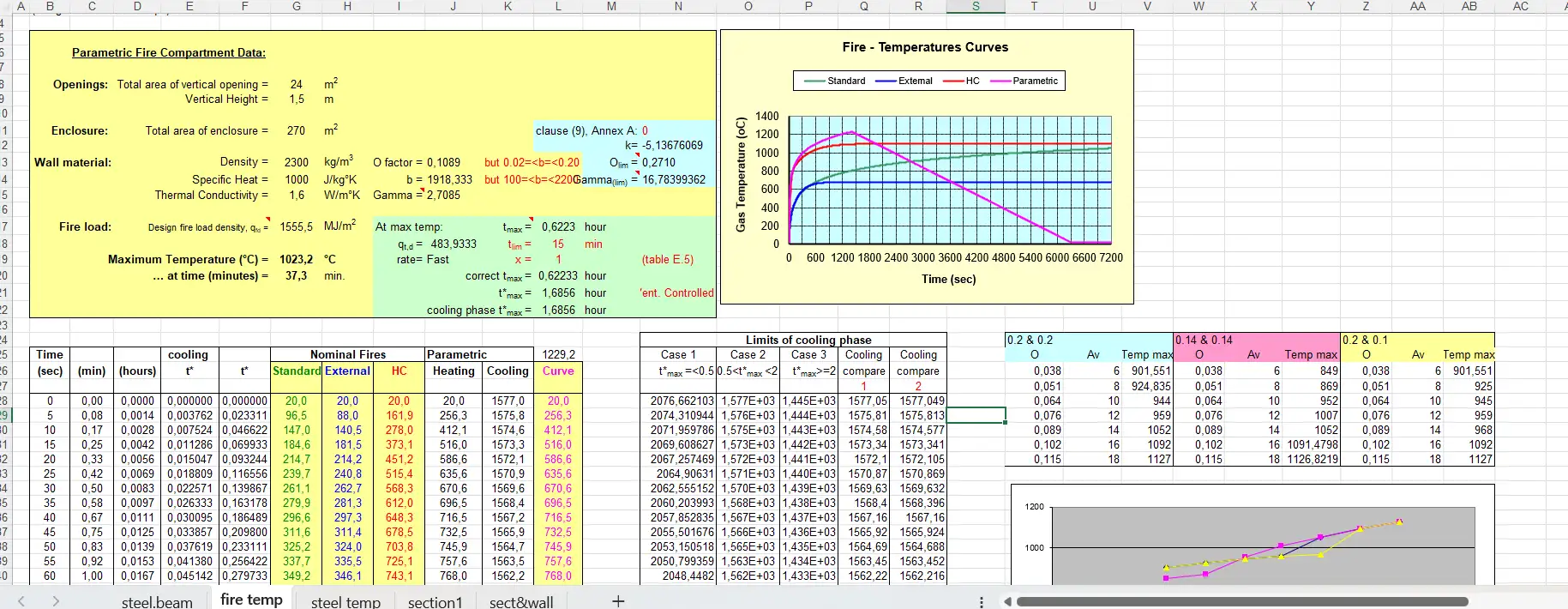 Bộ file bao gồm các bảng tính chi tiết về Đường cong Nhiệt độ Đám cháy (Nominal & Parametric), Nhiệt độ thép, và áp dụng cả Phương pháp Tra Bảng (Tabulated Data) lẫn Mô hình Tính toán Đơn giản (Simple Calculation Models).