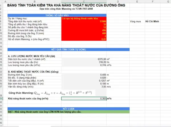 Excel bảng tính kiểm tra thoát nước đường ống mái nhà theo TCVN 7957 – 2008 ( Nước từ mái gôm bằng máng xối sau đó thoát qua ống tròn D …) . Có thể áp dụng mở rộng tính toán cho Khu vực nhà phố,  nhà xưởng diện tích mái rộng … Bảng tính thiết kế đơn giản dùng tham khảo tính toán hoặc tùy chỉnh theo nhu cầu , công thức tính toán thoát nước theo (Dựa trên công thức Manning và TCVN 7957:2008 ).