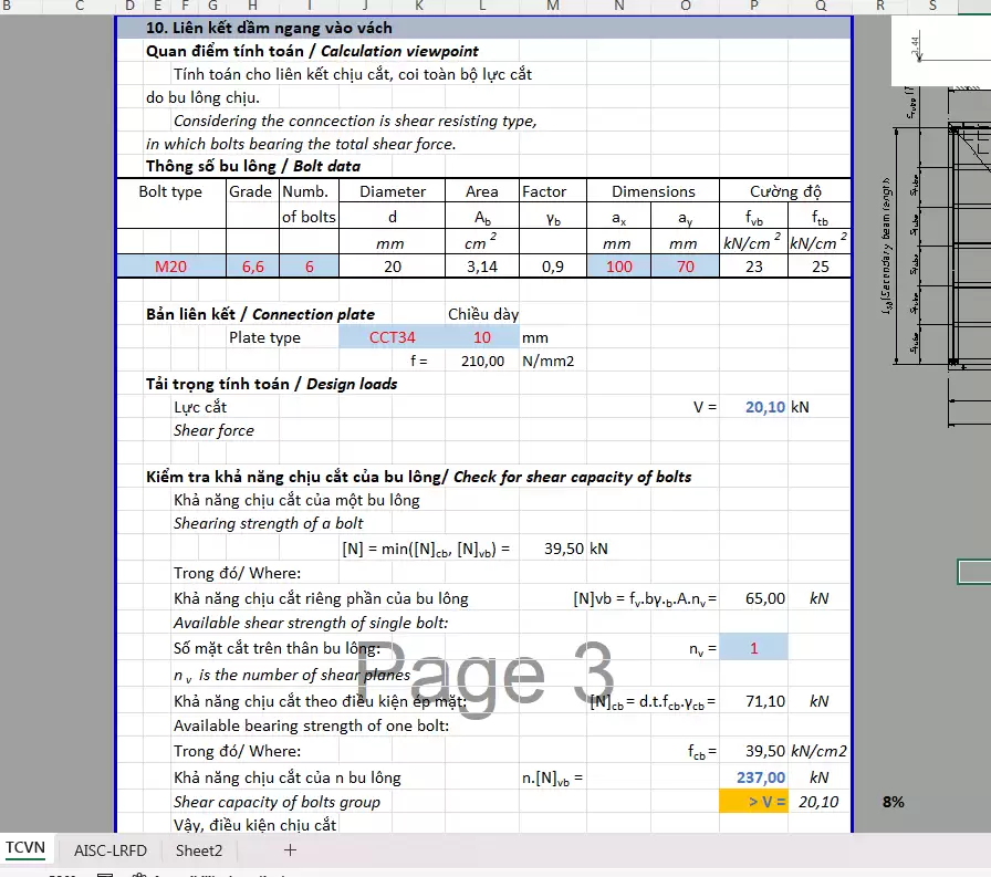 - Vật liệu chính: thép CCT34 (f = 2100 daN/cm²) và bê tông B40 (Rb = 22 MPa).