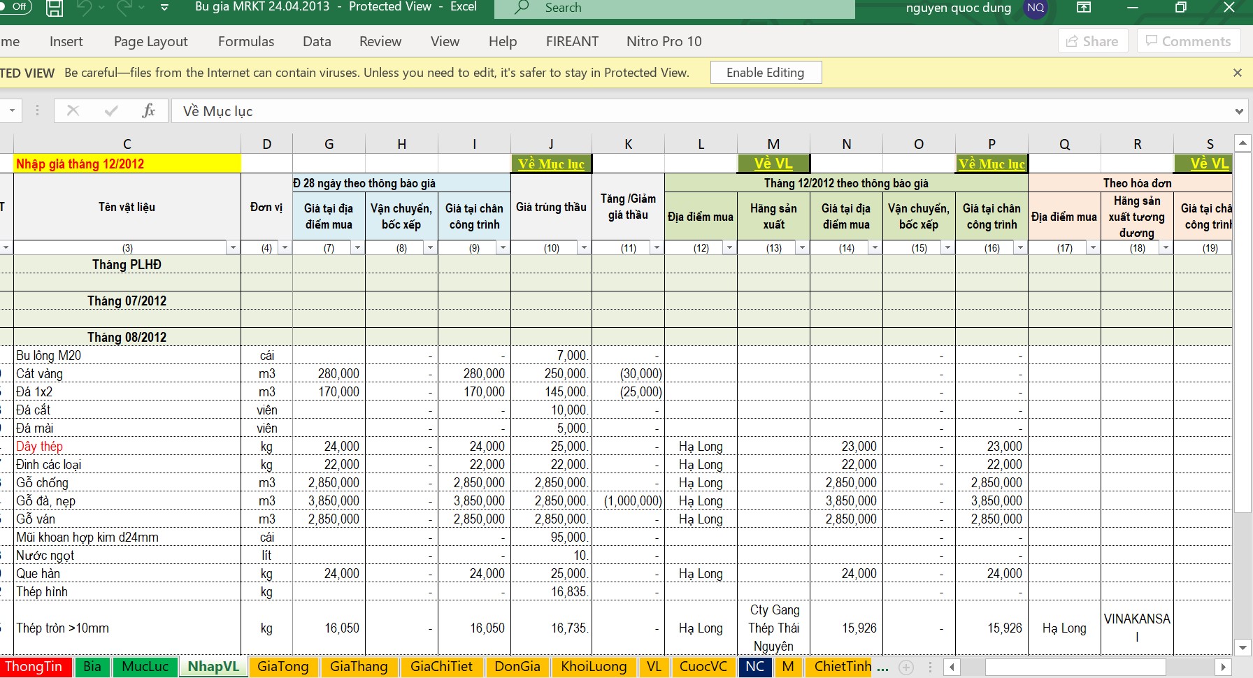 File mẫu excel thống kê bù giá : nhân công, vật liệu, ca máy…