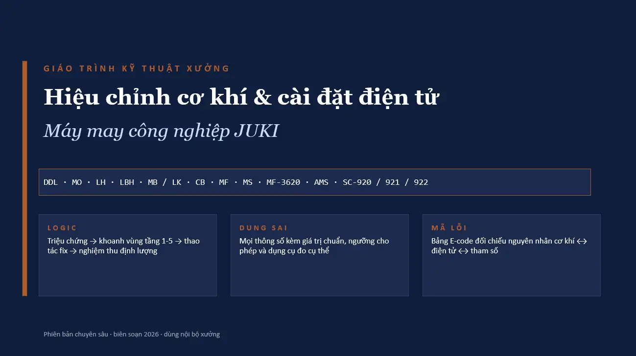 Triệu chứng → khoanh vùng tầng 1‑5 → thao tác fix → nghiệm thu định lượng ,Mọi thông số kèm giá trị chuẩn, ngưỡng cho phép và dụng cụ đo cụ thể ,
